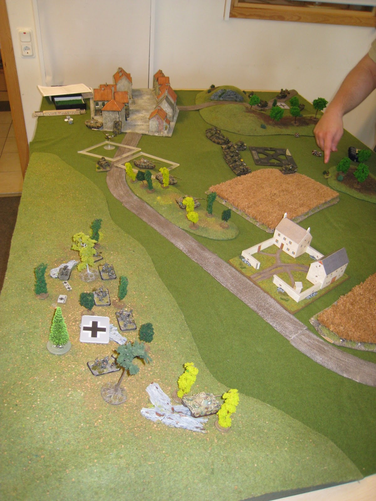 I första första slaget skulle jag försvara Galais i norr, den var 'out-of-supply', vilket gjorde att alla mina trupper hade 'ROF-1' och jag fick 'drivmedelstoken' (hälften av antalet motoriserade enheter). Det var ett 'Hasty Assault' och jag gjorde nog ett misstag i att sätta mina panthrar i 'ambush'. Skulle nog tait infanteri enheten med massa 'panzerfaust' istället. Men jag hade en plan där de skulle om tillfälle gavs hoppa upp i sina transporter och storma objektivet på motståndarsidan för ett snabbt avslut. Nu blev det inte så då de låg 'pinnade' i tre rundor. Istället så rusade min motståndare 'Threadhead' mitt objektiv och gjorde processen kort med mina panthrar. Att ha ROF 1 på panthrar hindrar deras kampförmåga rejält! Regeln kändes brutal, men ändå lämplig om man nu är utan underhåll. Man får fundera i början av varje runda var man behöver kunna flytta sig.